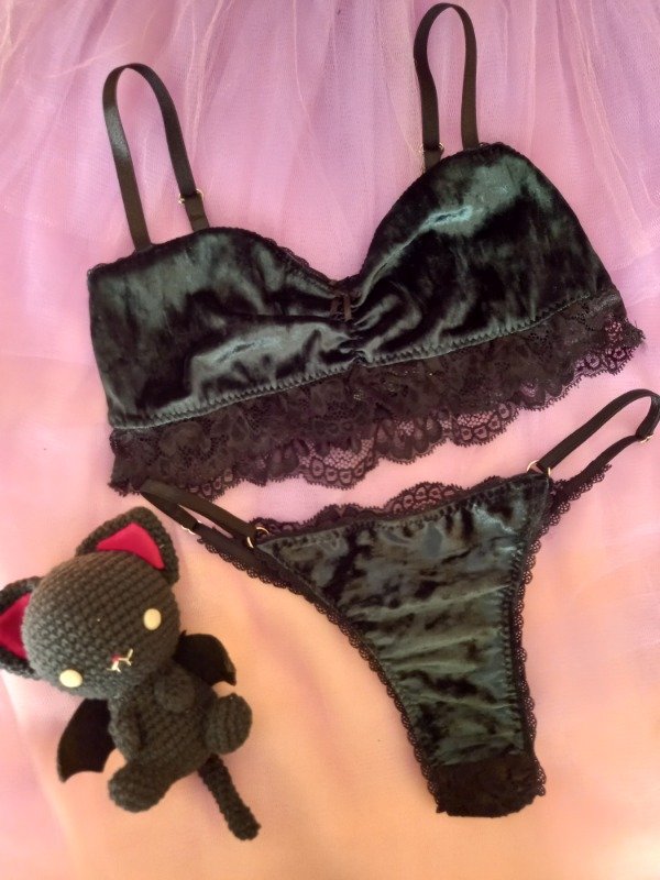 Conjunto de terciopelo verde combinado con puntilla negra. Tanga less regulable
